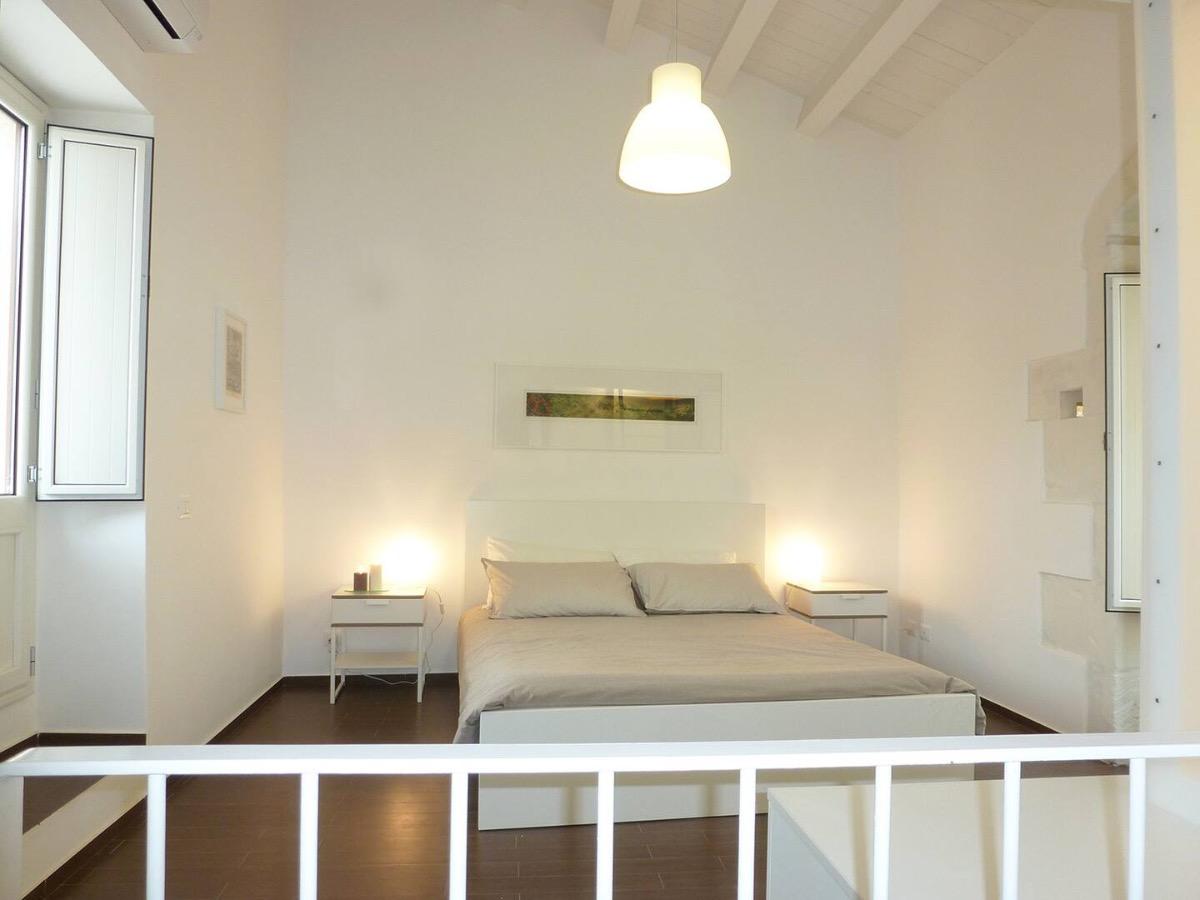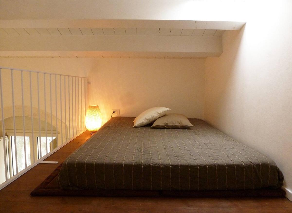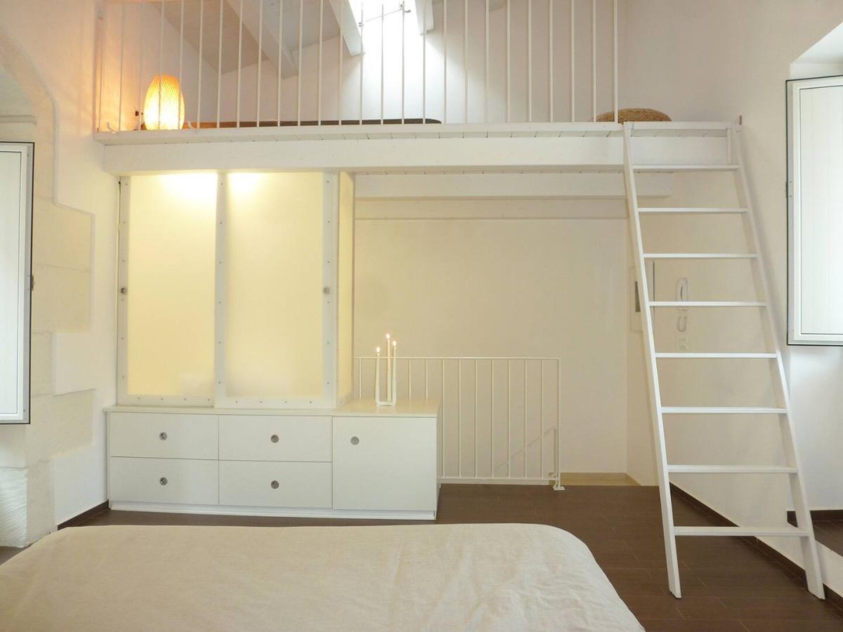 Un intimo soppalco in legno, raggiungibile tramite una scala a pioli, nasconde un confortevole letto futon, ideale per rifugiarsi tra le pagine di un libro o per dedicarsi alla meditazione, sospesi tra arte e storia.